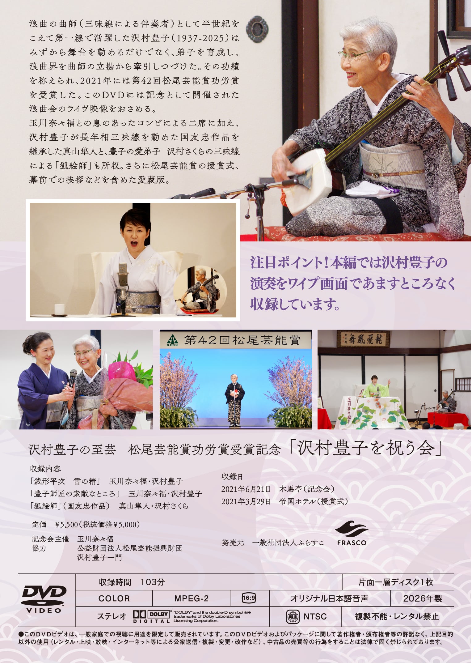 だけでなく、多くの弟子を育成し、曲師の立場から浪曲界を牽引した。その功績を認められ、2021年には第42回松尾芸能賞功労賞を受賞。本DVDにはその記念として開催された「沢村豊子を祝う会」の高座をおさめる。